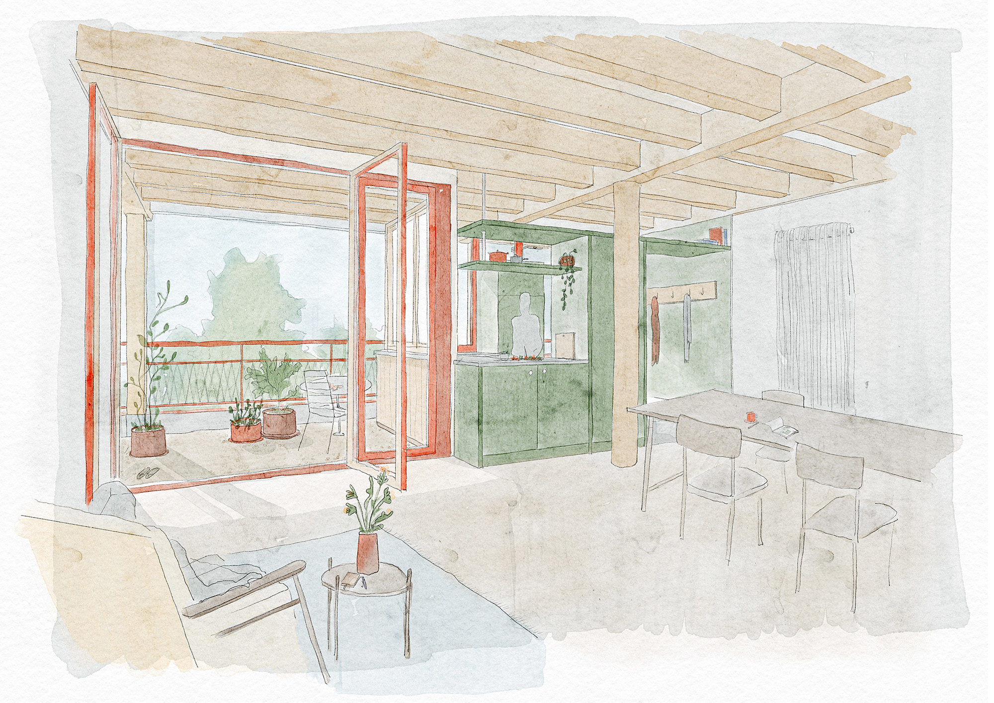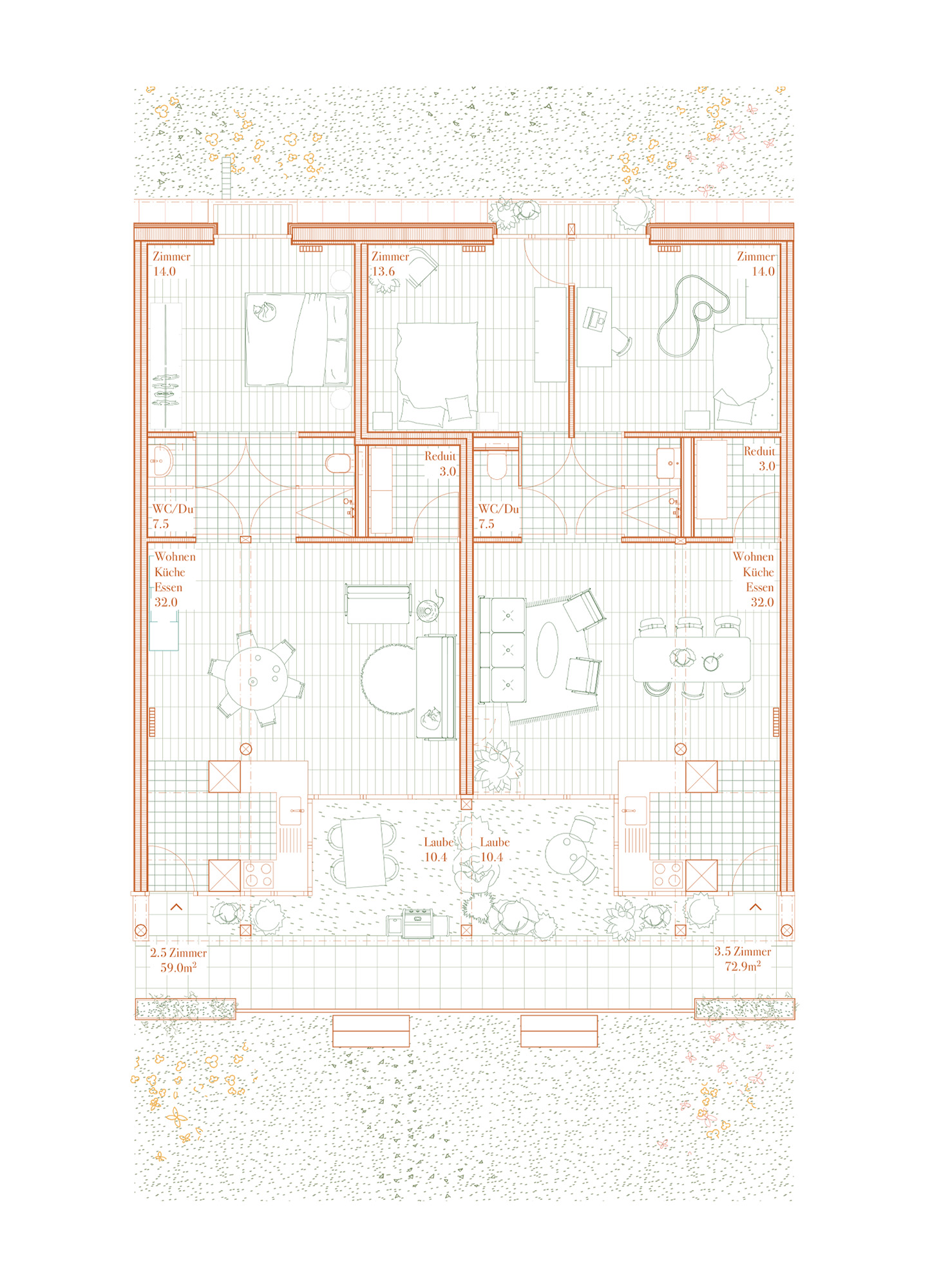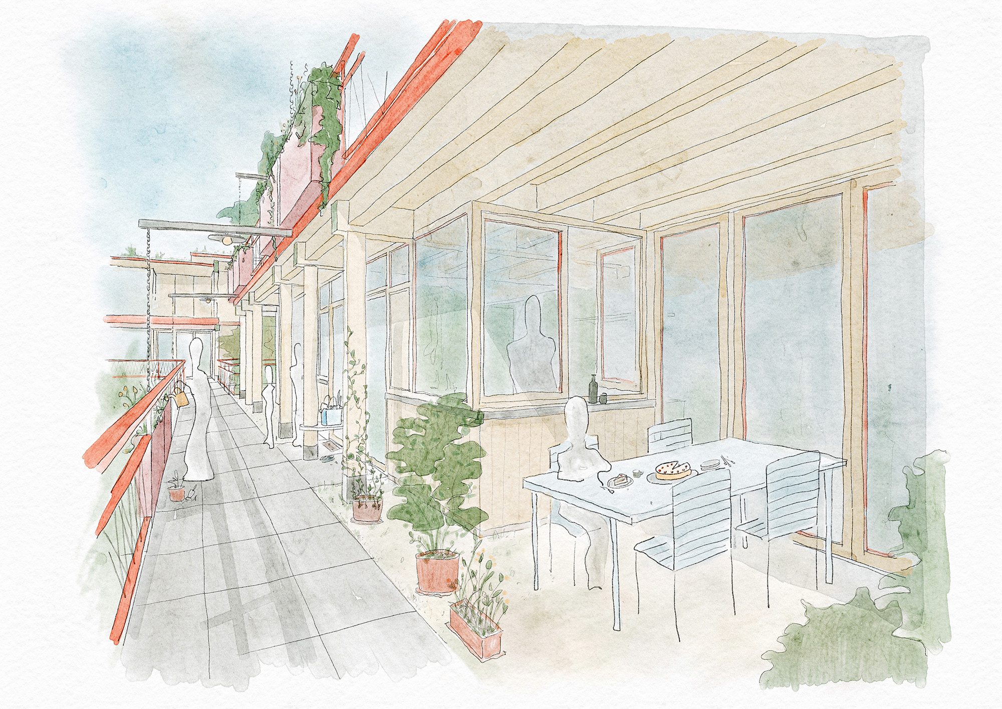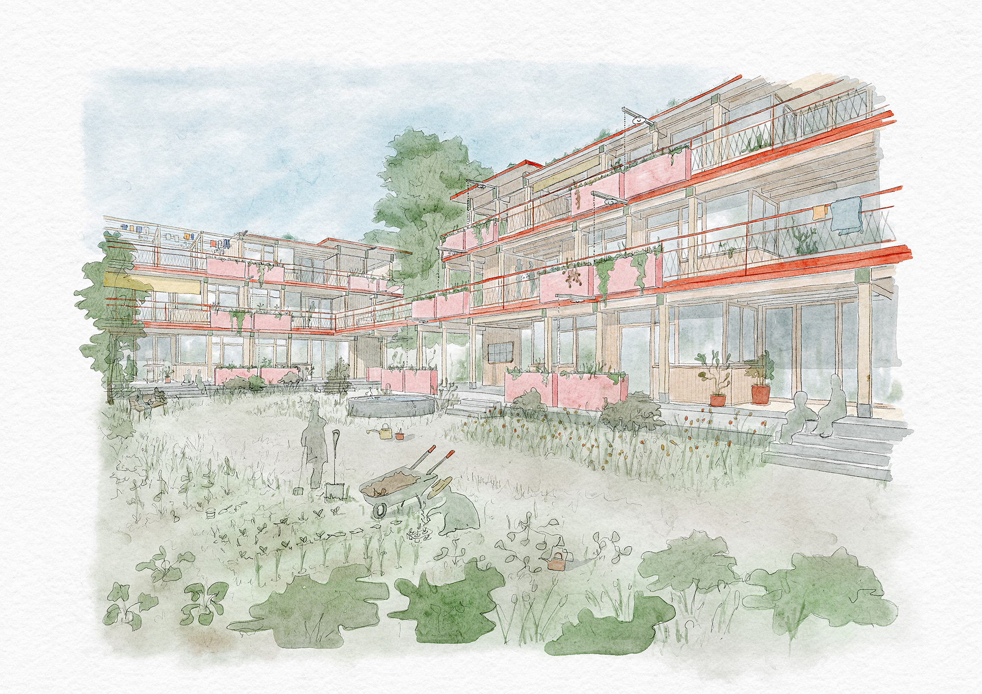 Semiramis Zurück SEMIRAMIS Projektwettbewerb Wartenbergstrasse 47 Pratteln, in Zusammenarbeit mit Joshua Meier & Natalia Pieroni Konzeptmodell Gartengeschoss Aquarell Natalia Pieroni Wohnungsgrundriss Aquarell Natalia Pieroni Situationsmodell Aquarell Natalia Pieroni